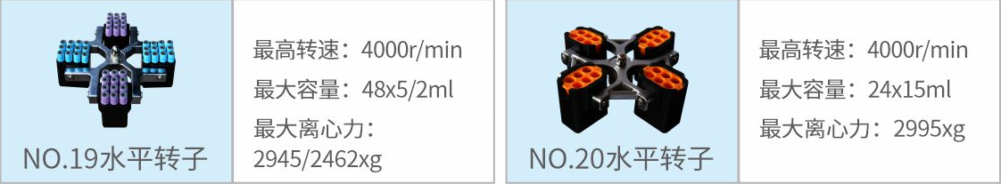 19 | 水平轉(zhuǎn)子 | 4000r/min | 48×5ml/2ml | 2945/2462xg |